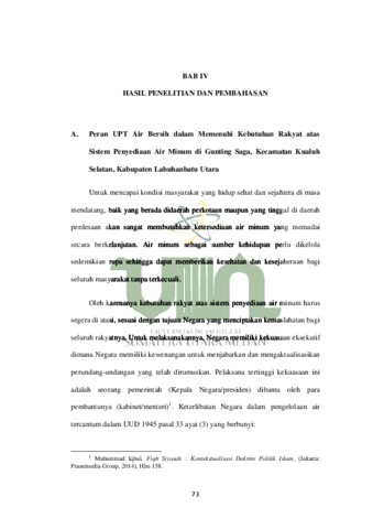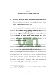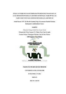 Penyediaan air minum merupakan salah satu kebutuhan dasar dan hak sosial masyarakat yang harus dipenuhi oleh pemerintah. Kegiatan menyediakan air minum diselenggarakan untuk memberikan pelayanan air minum kepada masyarakat untuk memenuhi hak rakyat atas air minum, hal ini tercantum dalam pasal 2 ayat (1) Peraturan Pemerintah No. 122 Tahun 2015 tentang Sistem Penyediaan Air Minum. Namun fakta yang terjadi di lapangan menunjukkan sistem penyediaan air di Kelurahan Gunting Saga belum terlaksana dengan baik dengan dibuktikannya pelayanan dan otorisasi pengelolaan yang belum diserahkan sepenuhnya dari pihak pemerintah daerah Labuhanbatu ke Labuhanbatu utara menyebabkan 479 pelanggan yang dirugikan dengan tidak dialirinya air ke rumah warga. Dengan distribusi pelayanan air yang tidak merata, keadaan tersebut menggambarkan persoalan penyediaan air masih sangat memprihatinkan dan hadirnya Peraturan Pemerintah No. 122 Tahun 2015 tentang Sistem Penyediaan Air Minum masih belum dilaksanakan dengan baik. Dalam penelitian ini, tujuan yang akan dicapai berdasarkan permasalahan diatas berupa; Untuk mengetahui bagaimana peran UPT dalam memenuhi hak rakyat atas sistem penyediaan air minum di Gunting Saga. Untuk mengetahui bagaimana implementasi PP No. 122 Tahun 2015 Tentang sistem penyediaan air minum di Gunting Saga. Untuk mengetahui tinjauan fiqh siyasah terhadap pemenuhan hak rakyat atas sistem penyedian air minum di Gunting Saga, menurut PP No. 122 Tahun 2015. Dalam penelitian skripsi ini penulis menggunakan metode penelitian yuridis empiris yaitu mengkaji ketentuan hukum yang berlaku dan dikaitkan dengan apa yang terjadi di masyarakat. Kemudian terjun langsung ke lapangan melihat bagaimana peraturan tersebut diterapkan dan dapat dianalisis dan diinterpretasikan melalui data yang terkumpul, menggunakan sumber data yaitu primer, sekunder dan tersier. Data primer didapatkan dari wawancara langsung ke bagian staff dan koordinator Kantor UPT Air Bersih Gunting Saga dan beberapa masyarakat Gunting Saga. Data sekunder didapatkan dari berbagai literature seperti buku, jurnal yang berhubungan dengan penelitian. Data tersier didapatkan dari internet, media cetak berupa berita dan artikel hasil wawancara. Hasil dari penelitian menunjukkan bahwa pemenuhan hak rakyat atas sistem penyediaan air minum menurut implementasi Peraturan Pemerintah No. 122 Tahun 2015 Tentang Sistem Penyediaan Air Minum tidak terealisasikan dikarenakan faktor administrasi terkait hak guna yang belum diselesaikan dan diserah terima dari Pemerintah Kabupaten Labuhanbatu ke Pemerintah Labuhanbatu Utara serta keuangan daerah yang tidak memadai sehingga UPT Air Bersih Gunting Saga belum mampu memenuhi kebutuhan hak rakyat atas penyediaan air minum