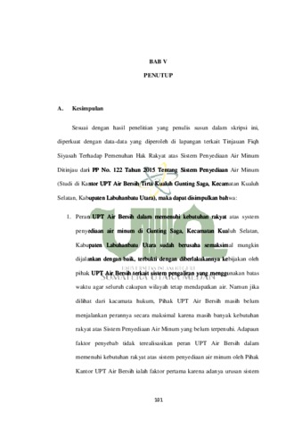 Utami, Andini Rizki (2022) Tinjauan Fiqh Siyasah Terhadap Pemenuhan Hak Rakyat Atas Sistem Penyediaan Air Minum Ditinjau dari Pp No. 122 Tahun 2015 Tentang Sistem Penyediaan Air Minum (Studi Kasus Upt Air Bersih Gunting Saga, Kecamatan Kualuh Selatan, Kabupaten Labuhanbatu Utara). Skripsi thesis, Universitas Islam Negeri Sumatera Utara Medan.