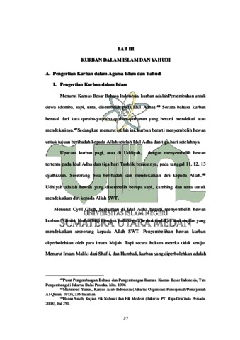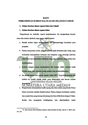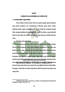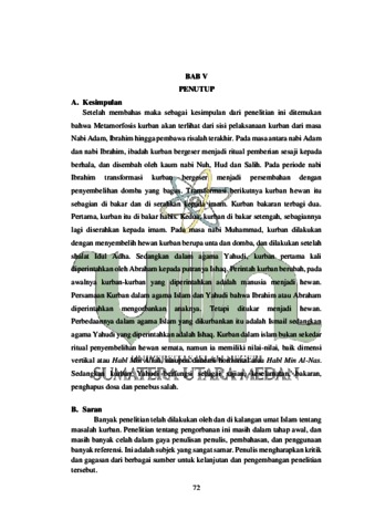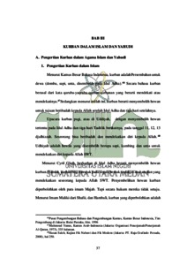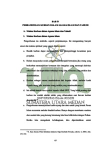 Metamorfosis Kurban dalam Agama Islam dan Yahudi. Perubahan ini akan terlihat dari sisi pelaksanaan kurban dari masa Nabi Adam, nabi Ibrahim hingga pada masa nabi Muhammad sebagai pembawa risalah terakhir. Kajian mengenai metamorfosis kurban inilah yang menjadi latar belakang masalah penelitian ini. Penulis akan melihat persoalan- persoalan yang berhubungan yakni: bagaimana metamorfosis peribadatan kurban dalam agama Islam dan Yahudi. Pembahasan ini juga mengkaji persamaan dan perbedaan kurban dalam agama Islam dan Yahudi. Demikian akan diketahui bagaimana kurban dalam agama Islam dan agama Yahudi sehingga akan ditemukan perbedaan antara keduannya. Jenis pendekatan penelitian yang digunakan penulis adalah Library Reaseach. Adapun analisis datanya menggunakan metode komperatif (perbandingan) Islam dan Yahudi, dengan pendekatan teologi. Hasil penelitian ini ialah disyariatkannya ibadah kurban, ia diperkenalkan kepada manusia dengan bentuk persembahan kepada Allah sesuai dengan apa yang dimiliki. Pada periode antara Nabi Adam hingga nabi Ibrahim, ibadah kurban bergeser menjadi ritual pemberian sesaji terhadap berhala, yang disembah oleh kaum nabi Nuh, kaum nabi Hud dan kaum nabi Salih. Pada periode nabi Ibrahim transformasi kurban bergeser menjadi persembahan dengan penyembelihan domba yang bagus. Transformasi ibadah kurban setelah masa nabi Ibrahim adalah dengan mengimami api sebagai tanda di terimanya kurban. Selanjutnya pada masa nabi Muhammad, ibadah kurban dilakukan dengan menyembelih binatang kurban berupa Bahimah Al An’am (hewan ternak), yang dilakukan setelah melaksanakan shalat Idul Adha. Sedangkan dalam agama Yahudi, perintah Kurban pertama dilakukan oleh Abraham kepada putranya Ishaq tetapi diganti dengan seekor domba. Perintah berkurban berubah dari manusia menjadi hewan Sebagai kesimpulan atau temuan skripsi ini persamaan kurban dalam agama Islam dan Yahudi bahwa Ibrahim atau Abraham diperintahkan untuk mengorbankan anaknya. Tetapi ditukar menjadi hewan. Perbedaannya dalam agama Islam yang diperintah dikurban itu adalah Ismail sedangkan agama Yahudi dipahami yang di kurbankan adalah Ishaq. Kurban dalam Islam bukan hanya sekedar ritual penyembelihan hewan semata, namun ia memiliki nilai-nilai, baik dimensi vertikal atau Habl Min Allah, maupun dimensi horizontal atau Habl Min Al-Nas. Sedangkan kurban Yahudi berfungsi sebagai sajian, keselamatan, bakaran, penghapus dosa dan penebus salah.