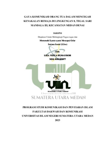 Humayroh, Liza Vesya (2023) Gaya Komunikasi Orang tua dalam Mencegah Kenakalan Remaja di Lingkungan 8, Kelurahan Tegal Sari Mandala III, Kecamatan Medan Denai. Skripsi thesis, Universitas Islam Negeri Sumatera Utara Medan.