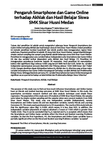 Tujuan dari penellitian ini adalah untuk mengetahui seberapa besar Pengaruh Smartphone dan Game Online terhadap Akhlak dan hasil belajar siswa di SMK Sinar Husni Medan. Dalam penelitian ini metode penelitian korelasi kuantitatif dan teknik analisis data menggunakan regresi linier sederhana. Populasi pelnelitian ini adalah 39 siswa SMK Sinar Husni Medan, sampel diambil dengan simple random sampling dan sampel yang diambil adalah beberapa siswa SMK Sinar Husni Medan. Penelitian ini menggunakan satu variabel bebas (independen) yaitu Smartphone dan Game Online (X) dan dua variabel terikat (dependen) yaitu Akhlak dan Hasil Belajar (Y). Pelnelitian ini menggunakan penyebaran kuesioner kepada 39 responden. Hasil pelnelitian ini menunjukkan bahwa nilai signifikansi (Sig.) sebesar 0,000 yang berarti lebih kecil dari 0,05. Selain itu, variabel independen (penempatan jurusan) diperoleh nilai Thitung sebesar 7,065 lebih besar dari Ttabel 2,026. Dengan demikian dapat disimpulkan bahwa H₀ditolak dan Hₐditerima yang artinya maka variabel Smartphone dan Game Online berpengaruh terhadap variabel Akhlak dan Problelmatika Belajar Siswa. Sehingga hipotesis pertama, H1: variabel Smartphone dan Game Online berpengaruh signifikan secara parsial terhadap variabel Akhlak dan Problelmatika Belajar Siswa “diterima”