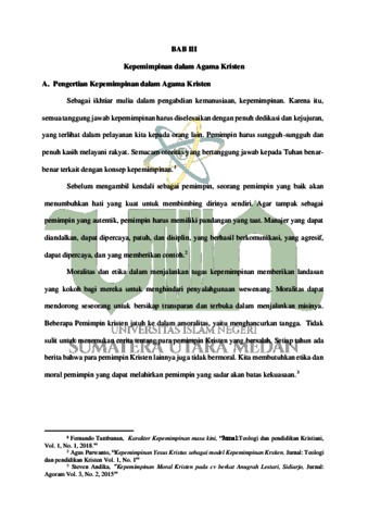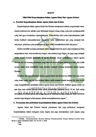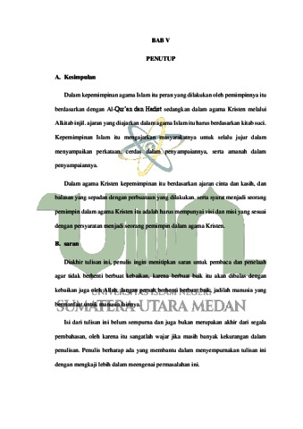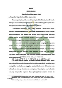 Nilai religius kepemimpinan dalam agama Islam itu dapat diketahui dari konsep dasar kepemimpinan dalam agama islam yaitu melalui ajaran Al-Qur’an dan Hadist. yang mana mengajarkan bagaimana menjadi seorang pemimpin yang bersikap adil, jujur, bijaksana, amanah, dan terpercaya. Tetapi nilai kepemimpinan dalam agama Kristen itu dilihat dari konsep ajaran kristen yang melalui Alkitab atau Injil, dan di dalmnya juga mengajarkan bagamana menjadi seorang pemimpin yang layak dipangil sebagai pemimpin, yang mempunyai visi dan misi kepemimpinna dan mempunyai watak menjadi pemimpin serta sudah dilatih dari kecil untuk menjadi seorang pemimpin yang setia. Penelitian ini dilakukan untuk mengetahui ajaran dari Al-Qur’an dan Hadist serta Alkitab atau Injil mengenai Nilai Religius Kepemimpinan dalam agama Islam dan Kristen. Penelitian ini tergolong pada penelitian kualitatif dengan menggunakan jenis penelitian kepustakaan (Library Research) dimaans egala data yang diambil dari berbagai buku dan sumber- sumber Ilmiah yang berkaitan dengan judul. Dalam penelitia ini di dasarkan pada literatur keagamaan dari Agama Islam dan Agama Kristen yang berkaitan dengan yang diteliti yaitu nilai religius kepemimpinan dalam Agama Islam dan Ktisten. Penelitian ini menggunakan pendekatan Teologi, dan menggunakan teori komperatif. dan tujuan dari penelitian ini adalah untuk mengetahui pandangan serta perbedaan AlQur’an, Hadist serta dalam Alkitab atau Injil terhadap nilai religius kepemimpinan.