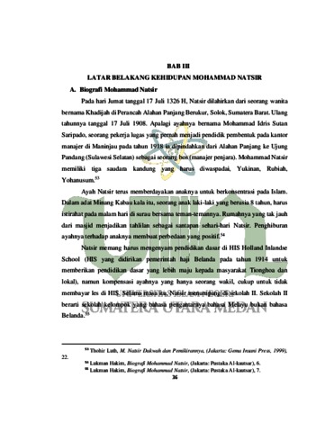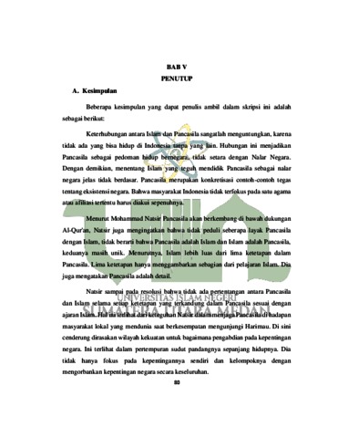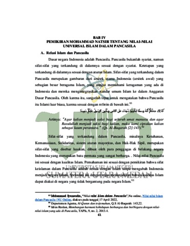 Skripsi ini menggambarkan bagaimana perenungan Mohammad Natsir terhadap sisi positif universalisme Islam dalam Pancasila. Mohammad Natsir adalah seorang peneliti Muslim Indonesia. Ia lahir di Alahan Panjang, Pemerintahan Solok, Sumatera Barat pada 17 Juli 1908. Kajian ini berpusat pada pertimbangan Mohammad Natsir tentang sifat-sifat keislaman yang terkandung dalam Pancasila. Penelitian ini menggunakan teknik subjektif melalui Kepustakaan (Library Exploration) dengan pendekatan Figure Thinking Study. Tujuan penelitian ini adalah untuk mengetahui bagaimana Mohammad Natsir merenungkan sifat-sifat keislaman yang terkandung dalam Pancasila. Manfaat dari kajian ini adalah menambah pemahaman untuk mengetahui sosok Mohammad Natsir dan seberapa berpengaruh beliau dalam persoalan pemerintahan Indonesia. Natsir menerima bahwa di bawah lindungan Alquran Pancasila akan tumbuh subur. Satu dengan yang lain tidak disimpulkan bermasalah namun tidak bisa dibedakan dengan cara yang sama. Natsir mengakui bahwa di atas kotoran dan lingkungan Islamlah Pancasila akan memiliki tubuh yang subur. Namun, menurutnya, akan muncul persoalan jika ketetapan Ketuhanan Yang Maha Esa hanya merupakan pepatah bagi orang-orang yang sangat ragu-ragu dan penuh dengan keganjilan terhadap agama Pancasila, maka akan mati. Jika undangundang dasar yang pada umumnya telah jatuh, seluruh isi Pancasila akan kosong, tidak memiliki struktur tertentu. Tinggal struktur Pancasila yang luar biasa sederhana digunakan untuk melingkupi setiap langkah kegiatan yang tanpa ketetapan, tidak sedikitpun bermoral