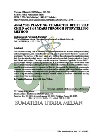 Rahmawati, Lia and Nasution, Fauziah (2023) Analysis Planting Character Belief Self Child Age 4-5 Years Through Storytelling Method. Ta'dib : Jurnal Pendidikan Islam, 12 (2). pp. 313-322. ISSN 2528-5092