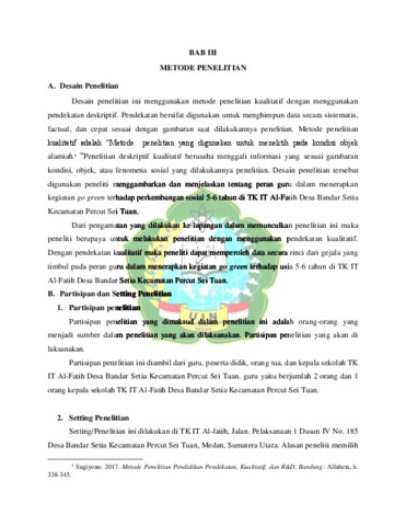 Penelitian ini bertujuan untuk mengetahui: (1) Peran guru terhadap perkembangan go green anak usia 5-6 tahun. (2). Bagaimana perkembangan sosial anak usia 5-6 tahun. Penelitian ini merupakan penelitian kualitatif dengan sumber data yang diperoleh dari observasi, wawancara dan dokumentasi. Penelitian ini dilaksanakan di TK IT Al-Fatih Jalan. Pelaksanaan 1 Dusun IV No.185 Desa Bandar Setia Kecamatan. Percut Sei Tuan Medan 20371. Jenis penelitian yang dilakukan adalah penelitian deskriftif dengan pendekatan kualitatif, pengumpulan data ini menggunakan observasi, wawancara dan dokumentasi. Penelitian ini melibatkan 2 orang guru. Dan data dianalis secara kualitatif dengan menggunakan cara reduksi data dan penarikan kesimpulan. Hasil penelitian menunjukkan bahwa perkembangan go green berpengaruh singnifikan terhadap perkembangan sosial anak bersama orang tua dan masyarakat menciptakan lingkungan kondusif dalam pembentukan karakter anak yang baik.