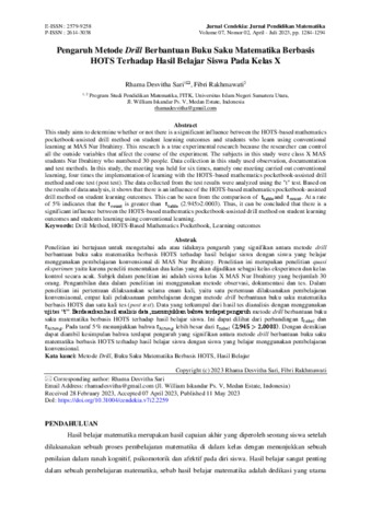 Sari, Rhama Desvitha and Rakhmawati, Fibri (2023) Pengaruh Metode Drill Berbantuan Buku Saku Matematika Berbasis HOTS terhadap Hasil Belajar Siswa pada Kelas X. Jurnal Cendekia: Jurnal Pendidikan Matematika, 7 (2). pp. 1284-1294. ISSN 2579-9258