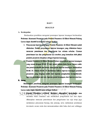 Konsep ISAK 35 yaitu dengan mengizinkan entitas berorientasi nonlaba menyesuaikan deskripsi yang digunakan untuk beberapa pos yang terdapat dalam laporan keuangan dan laporan keuangan itu sendiri mencakup laporan posisi keuangan, laporan penghasilan komprehensif, laporan perubahan aset neto, laporan arus kas, dan catatan atas laporan keuangan. Penelitian ini bertujuan untuk menerapkan laporan keuangan yang sesuai dengan pedoman akuntansi pesantren pada pesantren al-khoir.Metode penelitian yang digunakan adalah kualitatif. Pengumpulan data dilakukan melalui wawancara, observasi dan dokumentasi.Sedangkan teknik analisis data yang digunakan adalah dekskriptif analisis, Subjek penelitian ini terdiri dari kepala sekolah, staff keuangan dan staff tata usaha. Hasil dari penelitian pertama Penyusunan laporan keuangan Pondok Pesantren Al-Khoir Menanti sudah dilakukan. Dalam penyusunan laporan keuangan yang dilakukan dengan mencatat penerimaan dan pengeluaran kas selama sebulan. Catatan penerimaan kas dan pengeluaran kas tersebut yang kemudian oleh pihak pondok pesantren disajikan sebagai laporan keuangan. Yang kedua ini menunjukkan bahwa pengelolaan laporan keuangan belum memenuhi kebutuhan keempat unsur laporan keuangan, dimanapesantren belum mengenal ISAK 35. Akuntabilitas di dalam pesantren Al-khoir Menanti belum secara maksimal, dibuktikan dengan kurangnya pengetahun guru dan karyawan di dalam pesantren.