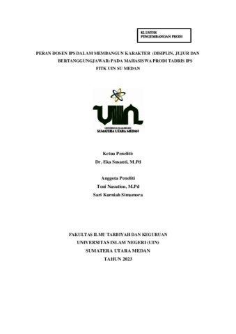 Susanti, Eka and Nasution, Toni and Simamora, Sari Kurniah (2023) Peran Dosen IPS Dalam Membangun Karakter (Disiplin, Jujur Dan Bertanggungjawab) Pada Mahasiswa Prodi Tadris IPS FITK UINSU Medan. Fakultas Ilmu Tarbiyah Dan Keguruan UINSU Medan.