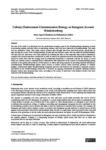 Hasibuan, Dana Agestri and Alfikri, Muhammad (2022) Culinary Endorsement Communication Strategy on Instagram Account @taukotembung. Daengku: Journal of Humanities and Social Sciences Innovation, 2 (3). ISSN 2775-6165