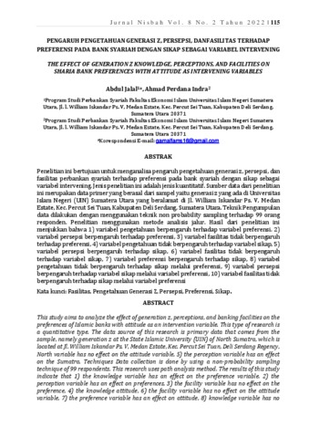 Jalal, Abdul and Indra, Ahmad Perdana (2022) Pengaruh Pengetahuan Generasi Z, Persepsi, Dan Fasilitas Terhadap Preferensi Pada Bank Syariah Dengan Sikap Sebagai Variabel Intervening. Jurnal Nisbah, 8 (2).