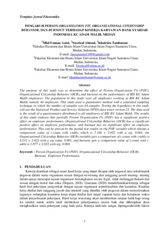 Azmi, Mhd Fauzan and Ahmad, Yusrizal and Tambunan, Khairina (2023) Pengaruh Person Organization Fit, Organizational Citizenship Behavior, dan Burnout terhadap Kinerja Karyawan Bank Syariah Indonesia KC Adam Malik Medan. Jurnal Ilmiah Edunomika, 7 (2). pp. 1-13. ISSN 2598-1153