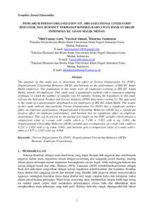 The purpose of this study was to determine the effect of Person Organization Fit (POF), Organizational Citizenship Behavior (OCB), and burnout on the performance of BSI KC Adam Malik employees. The population in this study were all employees working at BSI KC Adam Malik, namely 44 employees. This study used a quantitative method with a saturated sampling technique in which the number of samples was 44 samples. Testing the hypothesis in this study will use the Statistical Product and Service Solution (SPSS) data tester version 23. The data used is the result of a questionnaire distributed to all employees of BSI KC Adam Malik. The results of this study indicate that partially Person Organization Fit (POF) has a significant positive effect on employee performance, Organizational Citizenship Behavior (OCB) has a significant positive effect on employee performance, and burnuot has no significant effect on employee performance. This can be proven by the partial test results on the POF variable which obtains a comparison value of t-count with t-table which is 7.186 > 2.022 with a sig. 0.001, the Organizational Citizenship Behavior (OCB) variable gets a comparison of t-count with t-table is 8.231 > 2.022 with a sig value. 0.001, and burnout gets a comparison value of t-count with t�table is 1.877 < 2.022 with sig. 0.068.