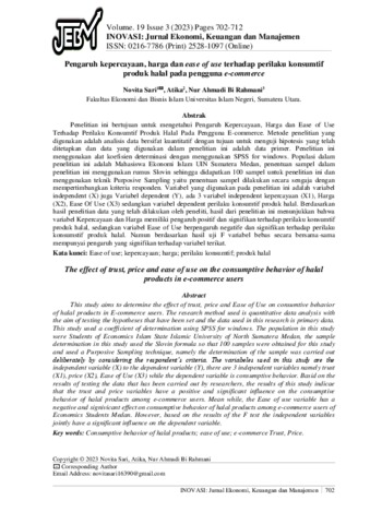 Sari, Novita and Atika, Atika and Rahmani, Nur Ahmadi Bi (2023) Pengaruh kepercayaan, harga dan ease of use terhadap perilaku konsumtif produk halal pada pengguna e-commerce. INOVASI: Jurnal Ekonomi, Keuangan dan Manajemen, 19. pp. 702-712. ISSN 0216-7786