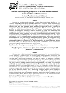 This study aims to determine the effect of trust, price and Ease of Use on consumtive behavior of halal products in E-commerce users. The research method used is quantitative data analysis with the aim of testing the hypotheses that have been set and the data used in this research is primary data. This study used a coefficient of determination using SPSS for windows. The population in this study were Students of Economics Islam State Islamic University of North Sumatera Medan, the sample determination in this study used the Slovin formula so that 100 samples were obtained for this study and used a Purposive Sampling technique, namely the determination of the sample was carried out deliberately by considering the respondent’s criteria. The variabeles used in this study are the independent variable (X) to the dependent variable (Y), there are 3 independent variables namely trust (X1), price (X2), Ease of Use (X3) while the dependent variable is consumptive behavior. Basid on the results of testing the data that has been carried out by researchers, the results of this study indicae that the trust and price variables have a positive and significant influence on the consumptive behavior of halal products among e-commerce users. Mean while, the Ease of use variable has a negative and signivicant effect on consumptive behavior of halal products among e-commerce users of Economics Students Medan. However, based on the results of the F test the independent variables jointly have a significant influence on the dependent variable