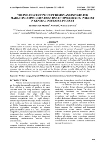 Munthe, Yusnita Ulfah and Nurbaiti, Nurbaiti and Syarvina, Wahyu (2023) The Influense Of Product Design And Integrated Marketing Communications On Customer Buying Interest In General Insurance Product. e-Jurnal Apresiasi Ekonomi, 11 (3). pp. 496-505. ISSN 2337-3997