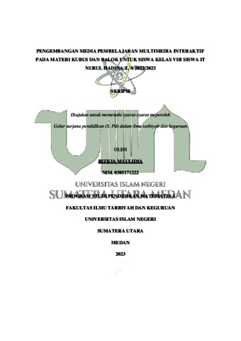 Maulidia, Rizkia (2023) Pengembangan Media Pembelajaran Multimedia Interaktif Pada Materi Kubus Dan Balok Untuk Siswa Kelas VIII Siswa IT Nurul Hadina T. A 2022/2023. Skripsi thesis, State Islamic University of North Sumatera.