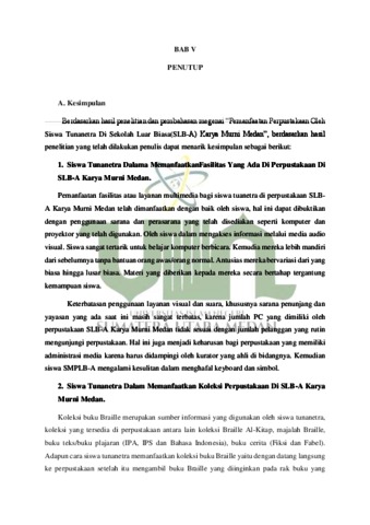 Penelitian ini membahas tentang Pemanfaatan Perpustakaan Oleh Siswa Tunanetra Di Sekolah Luar Biasa (SLB-A) Karya Murni Medan Penelitian ini dilakukan di Sekolah Luar Biasa (SLB-A) Karya Murni Medan. Tujuan dari penelitian ini adalah untuk mengetahui bagaimanasiswa tunanetra dalam memanfaatkan fasilitas dan koleksi yang ada di perpustakaan SLB-A Karya Murni Medan.Penelitian ini merupakan penelitian deskriptif dengan menggunakan pendekatan kualitatif, teknik pengumpulan data dengan observasi dan wawancara, dokumentasi dan analisis data dilakukan dengan cara reduksi data, penyajian data, dan penarikan kesimpulan. Hasil penelitian ini menujukkan bahwa pemanfaatan fasilitas perpustakaan bagi siswa tunanetra di peprustakaan SLB-A Karya Murni Medan sudah dimanfaatkan dengan baik oleh siswa, hal ini dapat dibuktikan dengan penggunaan sarana dan prasarana yang telah disediakan seperti komputer yang digunakan oleh siswa tunanetra dalam mengakses informasi melalui media audio visual. Kendala dalam penggunaan fasilitas seperti layanan multimedia yaitu sarana dan prasarana layanan yang masih terbatas. Koleksi buku Braille merupakan sumber informasi yang digunakan oleh siswa tunanetra, koleksi yang tersedia antara lain koleksi Al�Kitap Braille, buku pelajaran, buku cerita seperti fabel & fiksi. Pustakawan dan guru memiliki peran yang penting dalam peroses pemanfaatan koleksi buku Braille. Kendala yang dialami siswa tunanetra dalam memanfaatkan koleksi buku Braille antar lain kesulitan dalam mengambil dan mengembalikan buku, masih kurangnya koleksi di perpustakaan SLB-A Karya Murni Medan.