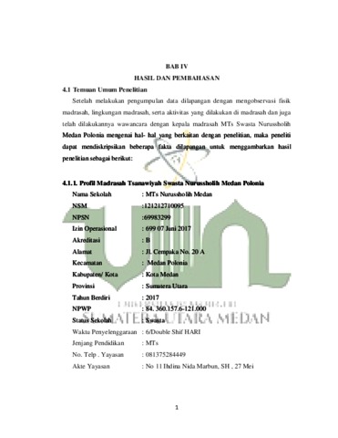 Penelitian ini secara umum, bertujuan untuk mendiskripsikan (1) Bagaimana Peran Kepemimpinan Kepala Madrasah Dalam Meningkatkan Sikap Disiplin Guru di MTs Swasta Nurussholih Medan Polonia (2) Bagaimana Sikap Kepala Madrasah Dalam Membentuk Sikap Disiplin Guru di MTs Swasta Nurussholih Medan Polonia (3) Bagaimana Kendala dan Upaya Penanggulangan Kepala Madrasah Dalam Meningkatkan Sikap Disiplin Agar Efektif dan Efisien. Penelitian ini merupakan jenis penelitian kualitatif dengan menggunakan pendekatan studi kasus. Penelitian ini dilaksanakan di MTs Swasta Nurussholih Medan Polonia yang beralamat di Jl. Cempaka No. 20 Karawang Sari Rejo Medan Kecamatan Medan Polonia Sumatera Utara. Subjek dalam penelitian ini yaitu Kepala Madrasah, Wakil Kepala Madrasah, dan Guru. Adapun teknik yang digunakan dalam mengumpulkan data yaitu teknik observasi, wawancara dan dokumentasi. Teknik analisis dalam penelitian ini menggunakan reduksi data, penyajian data dan menarik kesimpulan. Penjamin keabsahan data dalam penelitian ini yaitu creadibility, transferability, depandibility, dan confirmanbility. Hasil penelitian ini menunjukkan bahwa (1) Kepemimpinan Kepala Madrasah MTs SwastaNurussholih Medan Polonia memiliki tujuh peran dalam meningkatkan sikap disiplin guru yaitu sebagai educator, manager, administrator, supervisor, leader, inovator, dan motivator. (2) Sikap kepala madrasah dalam membentuk sikap guru sudah baik karena kepala madrasah MTs Swasta Nurussholih Medan Polonia mampu memberikan contoh teladan terhadap guru- guru di madrasah. (3) Upaya kepala madrasah dalam meningkatkan sikap disiplin guru adalah sangat tegas dalam kehadiran guru, dan untuk kendalanya adalah guru- guru masih ada yang tidak tepat waktu datang ke madrasah karena jarak dari rumah ke sekolah lumayan jauh sehingga kurang dalam disiplin. Berdasarkan penelitian dapat disimpulkan bahwa kepemimpinan kepala madrasah dalam meningkatkan sikap disiplin guru di MTs Swasta Nurussholih Medan Polonia bahwasanya kepemimpinan kepala madrasah sudah baik dan menjadi contoh kepada warga madrasah dengan menerapkan tujuh peran kepemimpinannya yaitu sebagai educator, manager, administrator, supervisor, leader, inovator, dan motivator.