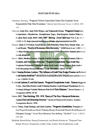 | Uncontrolled Keywords: | Kompleksitas Audit, Etika Auditor, Kualitas Audit dan Pemahaman Sistem Informasi Sebagai variabel Moderasi |