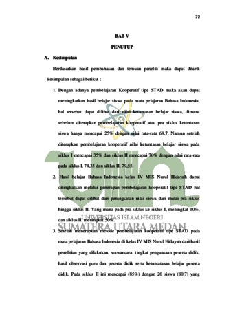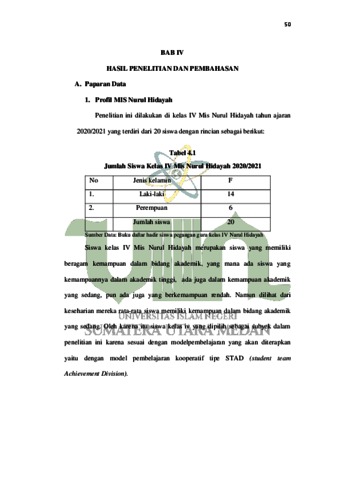 Tujuan dari penelitian ini 1. Untuk mengetahui hasil belajar Bahasa Indonesia siswa kelas IV MIS Nurul Hidayah setelah diterapkan pembelajaran kooperatif tipe STAD. 2. Untuk mengetahui seberapa besar peningkatan hasil belajar Bahasa Indonesia siswa kelas IV MIS Nurul Hidayah melalui pembelajaran kooperatif tipe STAD. 3. Untuk mengetahui peningkatan kemampuan siswa dalam memahami materi sesudah menggunakan model pembelajaran kooperatif Tipe STAD pada pembelajaran Bahasa Indonesia di kelas IV MIS Nurul Hidayah. Jenis penelitian ini adalah penelitian tindakan kelas (PTK) yang menggunakan tahapan berupa siklus, yaitu siklus I dan siklus II. Subjek penelitian ini adalah siswa kelas IV MIS Nurul Hidayah semester II dengan jumlah 14 siswa laki-laki dan 6 siswa perempuan. Berdasarkan penelitian yang dilakukan dapat disimpulkan bahwa (1) kemampuan siswa pada pelajaran bahasa indonesia sebelum menggunakan model pembelajaran kooperatife tipe STAD mencapai 25% hanya 5 siswa yang tuntas mencapai KKM. (2) hasil belajar siswa setelah menerapkan model pembelajaran kooperatife tipe STAD pada siklus I mencapai 35% terdapat 8 siswa yang tuntas dan mencapai KKM. Sedangkan pada siklis II siswa yang tuntas dan mencapai KKM adalah 17 siswa dengan persentase 85%. Dan hal tersebut dapat diktakan telah mencapai klasikal belajar 85%. (3) hasil belajar siswa pra siklus adalah 25% dan siklus I 35% dan pada siklus II mencapai 85%. Dengan demikian dapat disimpulkan bahwa dengan menggunakan model pembelajaran kooperatife tipe STAD dapat meningkatkan hasil belajar siswa kelas IV siswa MIS Nurul Hidayah pada pembelajaran Bahasa Indonesia.