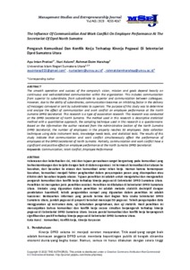 Kelancaran dan keberhasilan visi, misi dan tujuan perusahaan sangat bergantung pada komunikasi yang berkesinambungan dan terjalin dengan baik di dalam organisasi. Ini termasuk komunikasi dari atasan ke bawahan, dari bawahan ke atasan dan komunikasi antar rekan kerja. Namun karena kemampuan bawahan, komunikasi menjadi faktor penghambat dalam penyampaian pesan yang disampaikan atau dikirim oleh bawahan kepada atasan. Tujuan penelitian ini adalah untuk mengetahui dan menganalisis pengaruh komunikasi dan konflik kerja terhadap kinerja pegawai di Sekretariat DPRD Sumatera Utara. Penelitian ini merupakan jenis penelitian asosiasi. Penelitian ini dilakukan di Sekretariat DPRD Sumatera Utara. Metode yang digunakan dalam penelitian ini adalah metode statistik deskriptif dengan pendekatan kuantitatif, teknik pengambilan sampel yang digunakan dalam penelitian ini adalah kuesioner. Berdasarkan informasi yang penulis terima dari Bagian Tata Usaha Sekretariat DPRD Sumatera Utara, jumlah pegawai di properti tersebut mencapai 50 pegawai. Teknik pengumpulan data menggunakan uji instrumen data, uji kebutuhan pengetahuan, dan uji statistik. Hasil penelitian ini menunjukkan bahwa komunikasi dan konflik kerja secara simultan berpengaruh terhadap kinerja pegawai di Sekretariat DPRD Sumatera Utara. Secara parsial komunikasi dan konflik kerja berpengaruh signifikan dan positif terhadap kinerja pegawai di Sekretariat DPRD Sumatera Utara