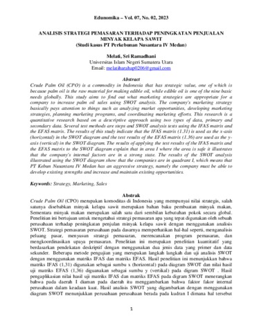 Melati, Harahap and Sri, Ramadhani (2023) Analisis Strategi Pemasaran Terhadap Peningkatan Penjualan Minyak Kelapa Sawit (Studi Kasus PT Perkebunan Nusantara IV Medan). Jurnal Edunomika, Vol. 7 (N0. 2). pp. 1-13.