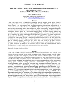 Crude Palm Oil (CPO) merupakan komoditas di Indonesia yang mempunyai nilai strategis, salah satunya disebabkan minyak kelapa sawit merupakan bahan baku pembuatan minyak makan, Sementara minyak makan merupakan salah satu dari sembilan kebutuhan pokok secara global. Penelitian ini bertujuan untuk mengetahui strategi pemasaran apa yang tepat digunakan oleh sebuah perusahaan terhadap peningkatan penjulan minyak kelapa sawit dengan menggunakan analisis SWOT. Strategi pemasaran perusahaan pada dasarnya memperhatikan hal-hal seperti, menganalisis peluang pasar, menyusun strategi pemasaran, merencanakan program pemasaran, dan mengkoordinasikan upaya pemasaran. Penelitian ini merupakan penelitian kuantitatif yang berdasarkan pendekatan deskriptif dengan menggunakan dua jenis data yang primer dan data sekunder. Beberapa metode pengujian yang merupakan langkah langkah dan uji analisis SWOT dengan menggunakan matriks IFAS dan matriks EFAS. Hasil penelitian ini menunjukkan bahwa matriks IFAS (1,31) digunakan sebagai sumbu x (horizontal) pada diagram SWOT dan nilai hasil uji matriks EFAS (1,36) diguanakan sebagai sumbu y (vertikal) pada digram SWOT . Hasil pengaplikasian nilai hasil uji matriks IFAS dan matriks EFAS pada digram SWOT menerangkan bahwa pada daerah I diaman pada daerah itu menggambarkan bahwa faktor fakor internal perusahaan dalam keadaan kuat. Hasil analisis SWOT yang digambarkan dengan menggunakan diagram SWOT menunjukkan perusahaan perusahaan berada pada kudran I dimana hal tersebut berarti bahwa PT perkebunan Nusantara IV Medan adalah startegi agresif yaitu perusahaan harus mampu mengembangkan kekuatan yang ada dan meningkatkan serta mempertahankan peluang yang ada.