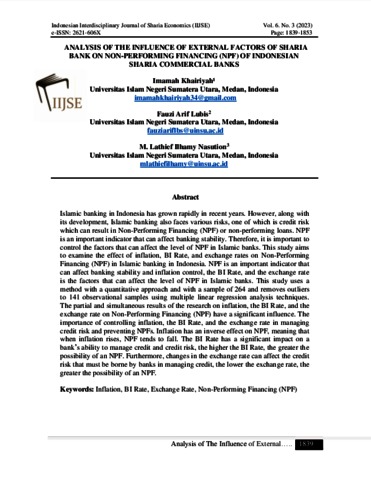 Khairiyah, Imamah and Lubis, Fauzi Arif and Nasution, M. Latief Ilhamy (2023) Analysis of the Influence of External Factors of Sharia Bank on Non-Performing Financing (NPF) of Indonesian Sharia Commercial Banks. Indonesian Interdisciplinary Journal of Sharia Economics (IIJSE), 6 (3). pp. 1839-1853. ISSN 2621-606X