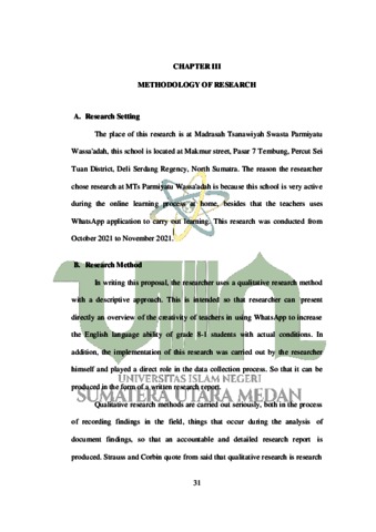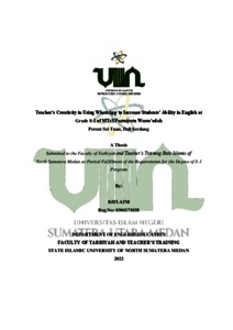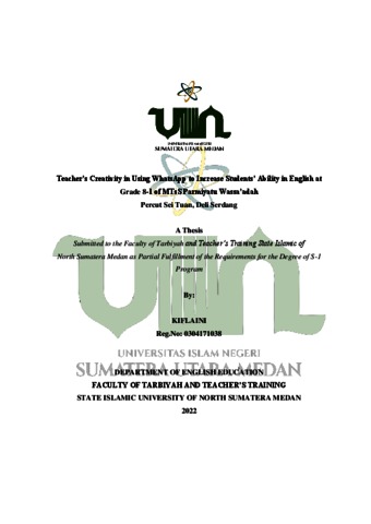Kiflaini, Kiflaini (2022) Teacher’s Creativity in Using WhatsApp to Increase Students’ Ability in English at Grade 8-1 of MTsS Parmiyatu Wassa’adah Percut Sei Tuan, Deli Serdang. Masters thesis, State Islamic University of North Sumatera.