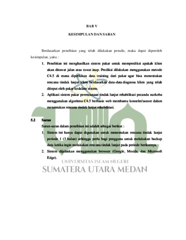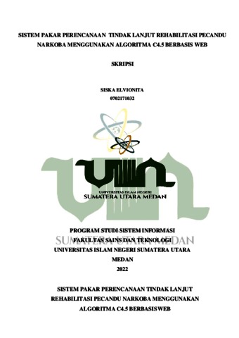 Elvionita, Siska (2022) SISTEM PAKAR PERENCANAAN TINDAK LANJUT REHABILITASI PECANDU NARKOBA MENGGUNAKAN ALGORITMA C4.5 BERBASIS WEB. Skripsi thesis, State Islamic University of North Sumatera.
