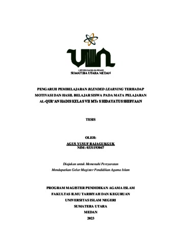 Rajagukguk, Agus Yusuf (2023) Pengaruh Pembelajaran Blended Learing Terhadap Motivasi Dan Hasil Belajar Siswa Pada Mata Pelajaran Al-Qur'an Hadis Kelas VII MTs S Hidayatus Shibyaan. Masters thesis, State Islamic University of North Sumatera.