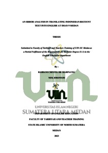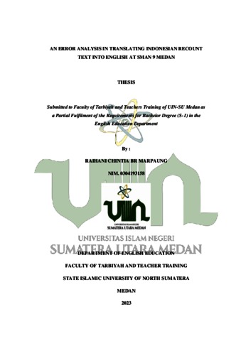 Marpaung, Raihani Chintia BR (2023) An Error Analysis In Translating Indonesian Recount Text Into English At SMAN 9 Medan. Skripsi thesis, State Islamic University of North Sumatera.