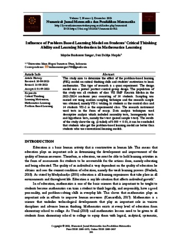 Siregar, Mayshe Baidannur and Narpila, Suci Dahlya (2023) Influence of Problem Based Learning Model on Students’ Critical Thinking Ability and Learning Motivation in Mathematics Learning. Jurnal Matematika dan Pendidikan Matematika, 7 (2). pp. 243-253. ISSN 2580-2437 (Submitted)
