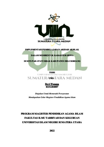 Wangsa, Devi (2022) IMPLEMENTASI PEMBELAJARAN AKIDAH AKHLAK DALAM MEMBENTUK KARAKTER SISWADI MTS PAB 4 PATUMBAK KABUPATEN DELI SERDANG. Masters thesis, State Islamic University of North Sumatera.