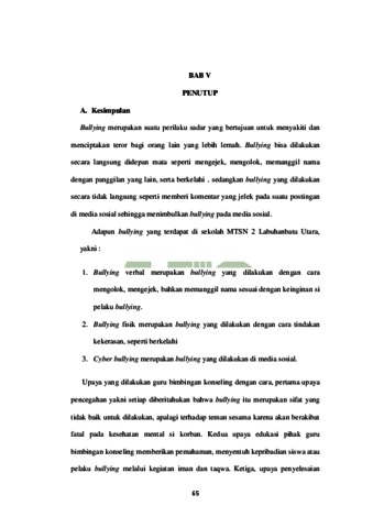 Penelitian ini didasari oleh banyaknya kasus-kasus bullying yang terjadi dikalangan siswa, dan secara khusus bullying yang terjadi antar siswa MTSN 2 Labuhanbatu Utara. Salah satu faktor kasus tersebut adalah keberagaman latar belakang anar siswa yang satu dan siswa yang lainnya, idealnya semua siswa harus menghargai perbedaan agar terciptanya situasi dan kondisi yang baik serta proses belajar yang kondusif dan nyaman. Penelitian ini bertujuan untuk mengetahui bentuk-bentuk bullying, dan upaya yang di lakukan guru bimbingan dan konseling dalam mengatasi bullying di MTSN 2 Labuhanbatu Utara serta Kerja sama guru bimbingan dan konseling bersama Komisi Perlindungan Anak Indonesia (KPAI) dalam mengatasi bullying di MTSN 2 Labuhanbatu Utara. Hasil penelitian menunjukkan bahwa bentuk-bentuk bullying di MTSN 2 Labuhanbatu Utara yaitu, bullying verbal, bullying fisik, dan cyber bullying. Adapun upaya yang dilakukan guru bimbingan konseling dengan cara, pencegahan, edukasi, penyelesaian, dan upaya tindak lanjut atau dengan cara memanggil orang tua. Kerja sama yang terjalin antara guru bimbingan konseling dan Komisi Perlindungan Anak Indonesia (KPAI) yakni dengan melakukan program pencegahan dan penanganan menggunakan intervensi pemulihan sosial (rehabilitasi) baik untuk pelaku bullying maupun korban bullying