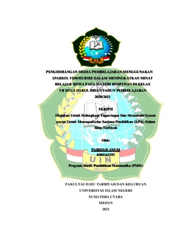 Anum, Paridah (2021) Pengembangan Media Pembelajaran Menggunakansparkol Vidioscribe Dalam Meningkatkan Minat Belajar Siswa Pada Materi Himpunan Di Kelas VII MTs.S Darul Ihsan Tahun Pembelajaran 2020/2021. Skripsi thesis, Universitas Islam Negeri Sumatera Utara Medan.