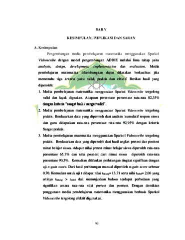 Penelitian ini bertujuan untuk mengembangkan dan menghasilkan media pembelajaran menggunakan Sparkol Videoscribe unruk meningkatkan Minat Belajar siswa yang valid, praktis dan efektif agar dapat diterapkan sebagai media pembelajaran matematika pada materi Himpunan. Jenis penelitian yang digunakan adalah penelitian pengembangan atau Research and Development (R&D) yang mengacu pada salah satau model atau pendekatan desain sistem pembelajaran yaitu model ADDIE yang merupakan singkatan dari Analysis, Design, Development, Implementation and Evaluation. Subjek penelitian adalah siswa kelas VIII MTs,S Darul Ihsan yang berjumlah 25 orang. Jenis data pada penelitian ini berupa data kuantitatif dan kualitatif. Instrumen penelitian yang digunakan adalah angket validasi media dan materi,angket minat belajar siswa, angket respon siswa dan guru serta tes hasil belajar siswa. Hasil penelitian menunjukkan: (1) Kevalidan media berdasarkan penilaian ahli media dan ahli materi mendapatkan rata-rata persentase sebesar 88,93% dengan kriteria “sangat baik/sangat valid”. (2) Kepraktisan media pembelajaran berdasarkan respon siswa dan guru setelah menggunakan media mendapatkan rata-rata persentase sebesar 92,70% yang termasuk kriteria “sangat praktis”. (3) Keefektifan media berdasarkan minat belajar siswa setelah menggunakan media pembelajaran matematika interaktif sebesar 90,50%. Dari hasil perhitungan manual diperoleh n-gain score sebesar 0,70. Kemudian untuk uji t didapat nilai thitung= 13,71 serta nilai ttabel= 2,06 yang artinya thitung > ttabel dan menunjukkan bahwa terdapat perbedaan yang signifikan antara rata-rata nilai pretest dan posttest. Berdasarkan hasil penelitian, penggunaan media pembelajaran menggunakan Sparkol Videoscribe untuk meningkatkan minat belajar siswa dapat dikatakan layak dengan kategori valid, praktis dan efektif.