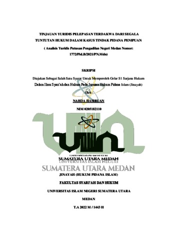 Hasibuan, Nahda (2022) Tinjauan Yuridis Pelepasan Terdakwa Dari Segala Tuntutan Hukum Dalam Kasus Tindak Pidana Penipuan (Analisis Yuridis Putusan Pengadilan Negeri Medan No.1772/Pid.B/2021/PN.Mdn). Skripsi thesis, Universitas Islam Negeri Sumatera Utara Medan.