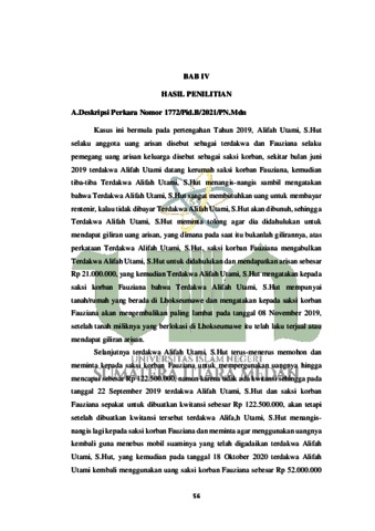 Adapun permasalahan yang diangkat dalam skipsi ini adalah kasus tindak pidana penipuan yang diproses dimuka pengadilan kemudian diputus lepas dari segala tuntutan hukum oleh majelis hakim. Penipuan adalah tindakan seseorang dengan tipu muslihat, rangkaian kebohongan, nama palsu dan keadaan palsu dengan maksud menguntungkan diri sendiri dengan tiada hak, rangkaian kebohongan ialah susunan kalimat-kalimat bohong yang tersusun demikian rupa yang merupakan cerita sesuatu yang seakan-akan benar. Berdasarkan hal tersebut maka penulis mengangkat permasalahan terkait mengenai bagaimana ketentuan dan dasar pertimbangan hakim Pengadilan Negeri Medan dalam perkara Nomor 1772/Pid.B/2021/PN.Mdn melepaskan terdakwa dari segala tuntutan hukum dalam kasus tindak pidana penipuan. Dalam penelitian ini penulis menggunakan metode penelitian hukum normatif. Tujuan dari penelitian ini adalah untuk mengetahui bagaimana kronologi, ketentuan hukum positif dan hukum pidana islam terhadap tindak pidana penipuan, dan dasar pertimbangan hakim Pengadilan Negeri Medan dalam perkara Nomor 1772/Pid.B/2021/PN.Mdn melepaskan terdakwa dari segala tuntutan hukum dalam kasus tindak pidana penipuan. Tindak pidana penipuan dalam Hukum Pidana umum dan Hukum pidana Islam merupakan perbuatan yang dilarang untuk dilakukan (haram), hukuman terhadap tindak pidana penipuan ada didalam KUHP Pasal 378; Sanksi menurut Hukum Pidana Islam terhadap tindak pidana penipuan dikenakan sanksi Ta‟zir. Menurut judul dari skripsi ini dasar pertimbangan hakim dalam menjatuhkan Putusan lepas dalam perkara ini adalah untuk dakwaan Pasal 378 KUHP yaitu dikarenakan tidak memenuhi unsur-unsur tindak pidana penipuan. Selanjutnya untuk Pasal 372 KUHP sudah memenuhi unsur akan tetapi perbuatan terdakwa bukan merupakan suatu tindak pidana, melainkan perbuatan hukum perdata, sehingga hakim menjatuhkan Putusan lepas dari segala tuntutan hukum.