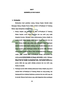 Penelitian ini bertujuan untuk mengetahui tentang budaya disiplin yang ada di sekolah MAS Al-Washliyah 22 Tembung Medan, serta upaya kepala sekolah dalam membuat dan menjalankan strateginya untuk meningkatkan budaya disiplin peserta didik di MAS Al-Washliyah 22 Tembung Medan, Dalam penelitian ini menggunakan jenis penelitian kualitatif dengan pendekatan grounded theory. Subjek dalam penelitian ini adalah kepala sekolah MAS Al-Washliyah 22 Tembung Medan, wakil kepala sekolah bidang kesiswaan, petugas tata usaha, guru-guru dan peserta didik MAS Al-Washliyah 22 Tembung Medan. Teknik yang digunakan dalam mengumpulkan data yaitu teknik wawancara, observasi dan dokumentasi. Analisis data dalam penelitian ini menggunakan analisis dari Miles dan Huberman meliputi (2015: 147-150): reduksi data, penyajian data dan menarik kesimpulan. Dan keabsahan data dalam penelitian ini yaitu creadibility, transferability, dependability, dan confirmability. Hasil penelitian ini menunjukkan bahwa : 1) Budaya disiplin yang diterapkan di MAS Al-Washliyah yang utama yaitu budaya disiplin waktu dan ii berpakaian, 2) Pandangan peserta didik terhadap pelaksanaan budaya disiplin tersebut sangat baik sesuai dengan harapan dan keinginan peserta didik itu sendiri, dengan adanya hal ini mereka merasa bahwa budaya disiplin ini merubah serta meningkatkan akhlakul karimah dan berperibadian baik, serta lebih menghargai dan memanfaatkan waktu dengan sebaik mungkin, 3) Upaya yang dilakukan kepala sekolah agar strategi yang digunakan kepala sekolah untuk meningkat budaya disipllin berjalan dengan baik yaitu; Pertama, kepala sekolah memberikan contoh dan keteladanan yang baik kepada peserta didik. Kedua, mengawasi serta memberi bimbingan berkala kepada peserta didik. Ketiga, dalam penyusunan peraturan dan tata tertib kepala sekolah melibatkan beberapa staff, guru, dan peserta didik. Dengan melibatkan peserta didik ini, diharapkan peserta dapat lebih bertanggung jawab dalam mematuhi peraturan dan tata tertib yang telah disepakati bersama. Upaya kepala sekolah dalam menjalankan strateginya untuk meningkatkan budaya disiplin peserta didik di MAS Al-Washliyah 22 Tembung Medan dapat diperoleh dari hasil kerjasama seluruh warga sekolah yang menjalankannya sesuai dengan tugas dan fungsinya masing-masing.