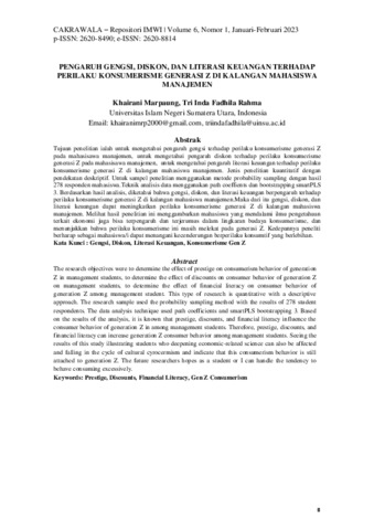 Marpaung, Khairani and Inda Fadhila Rahma, Tri (2023) PENGARUH GENGSI, DISKON, DAN LITERASI KEUANGAN TERHADAP PERILAKU KONSUMERISME GENERASI Z DI KALANGAN MAHASISWA MANAJEMEN. pp. 8-23. ISSN 2620-8490, 2620-8814