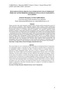 Tujuan penelitian ialah untuk mengetahui pengaruh gengsi terhadap perilaku konsumerisme generasi Z pada mahasisawa manajemen, untuk mengetahui pengaruh diskon terhadap perilaku konsumerisme generasi Z pada mahasisawa manajemen, untuk mengetahui pengaruh literasi keuangan terhadap perilaku konsumerisme generasi Z di kalangan mahasiswa manajemen. Jenis penelitian kuantitatif dengan pendekatan deskriptif. Untuk sampel penelitian menggunakan metode probability sampling dengan hasil 278 responden mahasiswa.Teknik analisis data menggunakan path coeffients dan bootstrapping smartPLS 3. Berdasarkan hasil analisis, diketahui bahwa gengsi, diskon, dan literasi keuangan berpengaruh terhadap perilaku konsumerisme generasi Z di kalangan mahasiswa manajemen.Maka dari itu gengsi, diskon, dan literasi keuangan dapat meningkatkan perilaku konsumerisme generasi Z di kalangan mahasiswa manajemen. Melihat hasil penelitian ini menggambarkan mahasiswa yang mendalami ilmu pengetahuan terkait ekonomi juga bisa terpengaruh dan terjerumus dalam lingkaran budaya konsumerisme, dan menunjukkan bahwa perilaku konsumerisme ini masih melekat pada generasi Z. Kedepannya peneliti berharap sebagai mahasiswa/i dapat menangani kecenderungan berperilaku konsumtif yang berlebihan.