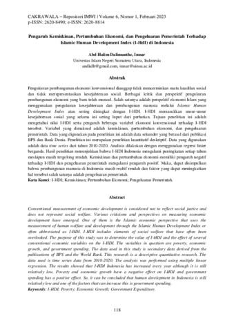 Dalimunthe, Abd Halim and Imsar, Imsar Pengaruh Kemiskinan, Pertumbuhan Ekonomi, dan Pengeluaran Pemerintah Terhadap Islamic Human Development Index (I-HdI) di Indonesia. Pengaruh Kemiskinan, Pertumbuhan Ekonomi, dan Pengeluaran Pemerintah Terhadap Islamic Human Development Index (I-HdI) di Indonesia. ISSN 2620-8814