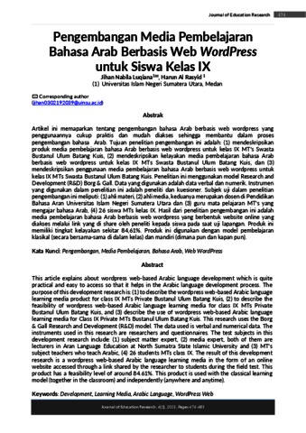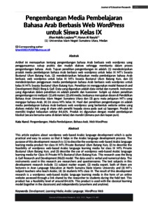 Artikel ini memaparkan tentang pengembangan bahasa Arab berbasis web wordpress yang penggunaannya cukup praktis dan mudah diakses sehingga membantu dalam prosespengembangan bahasa Arab. Tujuan penelitian pengembangan ini adalah: (1) mendeskripsikan produk media pembelajaran bahasa Arab berbasis web wordpress untuk kelas IX MT's Swasta Bustanul Ulum Batang Kuis, (2) mendeskripsikan kelayakan media pembelajaran bahasa Arab berbasis web wordpress untuk kelas IX MTs Swasta Bustanul Ulum Batang Kuis, dan (3) mendeskripsikan penggunaan media pembelajaran bahasa Arab berbasis web wordpress untuk kelas IX MTs Swasta Bustanul Ulum Batang Kuis. Penelitian ini menggunakan model Research and Development (R&D) Borg & Gall. Data yang digunakan adalah data verbal dan numerik. Instrumen yang digunakan dalam penelitian ini adalah peneliti dan kuesioner. Subjek uji dalam penelitian pengembangan ini meliputi: (1) ahli materi, (2) ahli media, keduanya merupakan dosen di Pendidikan Bahasa Aran Universitas Islam Negeri Sumatera Utara dan (3) guru mata pelajaran MT's yang mengajar bahasa Arab, (4) 26 siswa MTs kelas IX. Hasil dari penelitian pengembangan ini adalah media pembelajaran bahasa Arab berbasis web wordpress yang berbentuk website online yang diakses melalui link yang di share oleh peneliti kepada siswa pada saat uji lapangan. Produk ini memiliki tingkat kelayakan sekitar 84,61%. Produk ini digunakan dengan model pembelajaran klasikal (secara bersama-sama di dalam kelas) dan mandiri (dimana pun dan kapan pun).