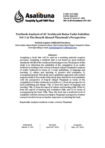 Sapitri, Nurlaila and Nasution, Sahkholid (0023) Textbook Analysis of Al-ʿArabiyyah Baina Yadai Aulādinā Vol 1 in The Rusydi Ahmad Thuaimah’s Perspective. Assalibuna, 07 (1). pp. 1-13. ISSN 2656-3533
