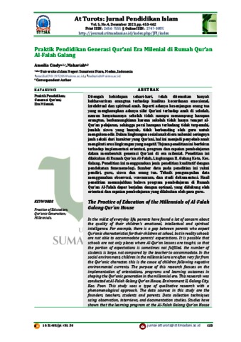 Cindy, Amelia and Mahariah, Mahariah (2023) Praktik Pendidikan Generasi Qur’ani Era Milenial di Rumah Qur’an Al-Falah Galang. At Turots: Jurnal Pendidikan Islam, Vol 5 (No 4). pp. 453-462. ISSN 2656-7555 , 2747-089X