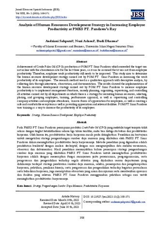 Sahputri, Andriani (2023) Analysis of Human Resources Development Strategy in Increasing Employee Productivity at PMKS PT. Pandawa's Ray. Jurnal Ekonomi Syariah Indonesia (JESI), XIII (2). pp. 358-371.