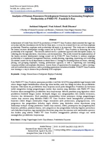 Achievement of Crude Palm Oil (CPO) production at POM PT. Sinar Pandawa which exceeded the target was not in line with the absenteeism rate for the last three years, so it can be assumed that it was not from employee productivity. Therefore, employee work productivity still needs to be improved. This study aims to determine the human resource development strategy carried out by POM PT. Sinar Pandawa in increasing the work productivity of its employees. The research method used is a qualitative approach with descriptive analysis, by collecting data through interviews, observation, and documentation. The results showed the implementation of the human resource development strategy carried out by POM PT. Sinar Pandawa to increase employee productivity is to implement management functions, namely planning, organizing, supervising, and controlling all activities carried out by all departments in which there is a strategy for recruiting human resources, selecting, placing, and grouping employees, training, performance appraisal, as well as supervising and controlling company activities and employee attendance, various forms of appreciation for employees, as well as creating a safe and comfortable ecosystem as well as providing appreciation and relevant facilities. POM PT. Sinar Pandawa uses training as a way to increase the productivity of its employees.