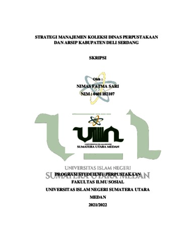 Sari, Nimas Fatma (2023) STRATEGI MANAJEMEN KOLEKSI DINAS PERPUSTAKAAN DAN ARSIP KABUPATEN DELI SERDANG. Skripsi thesis, State Islamic University of North Sumatra.