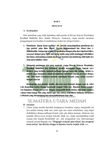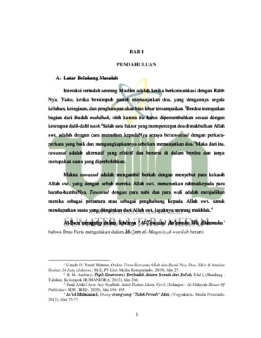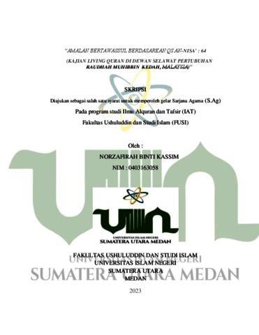 binti Kassim, Norzafirah (2023) Amalan Bertawassul Berdasarkan QS an-Nisa’ :64 (Kajian Living Quran di Dewan Selawat Pertubuhan Raudhah Muhibbin Kedah, Malaysia). Skripsi thesis, UNIVERSITAS ISLAM NEGERI SUMATERA UTARA MEDAN.